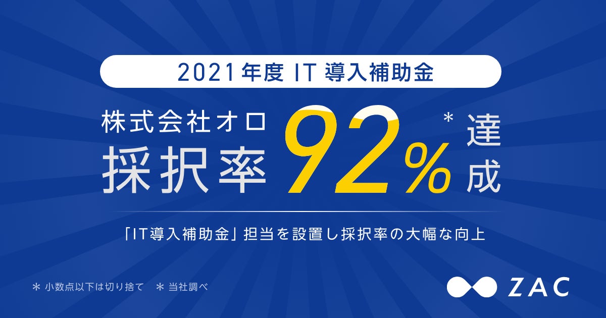 クラウドERP「ZAC」(以下、ZAC)を提供する株式会社オロ(本社:東京都目黒区、代表取締役社⻑:川田 篤、以下、オロ)は、2021年度IT導入補助事業にて採択率92%*を達成したことをご報告いたします。オロでは採択率向上を目的に、「IT導入補助金」担当コンサルタントを設置し、2020年度採択率54%*(48社中26社が採択)から2021年度採択率92%*(27社中25社が採択)へと採択率の大幅な向上に成功しています。