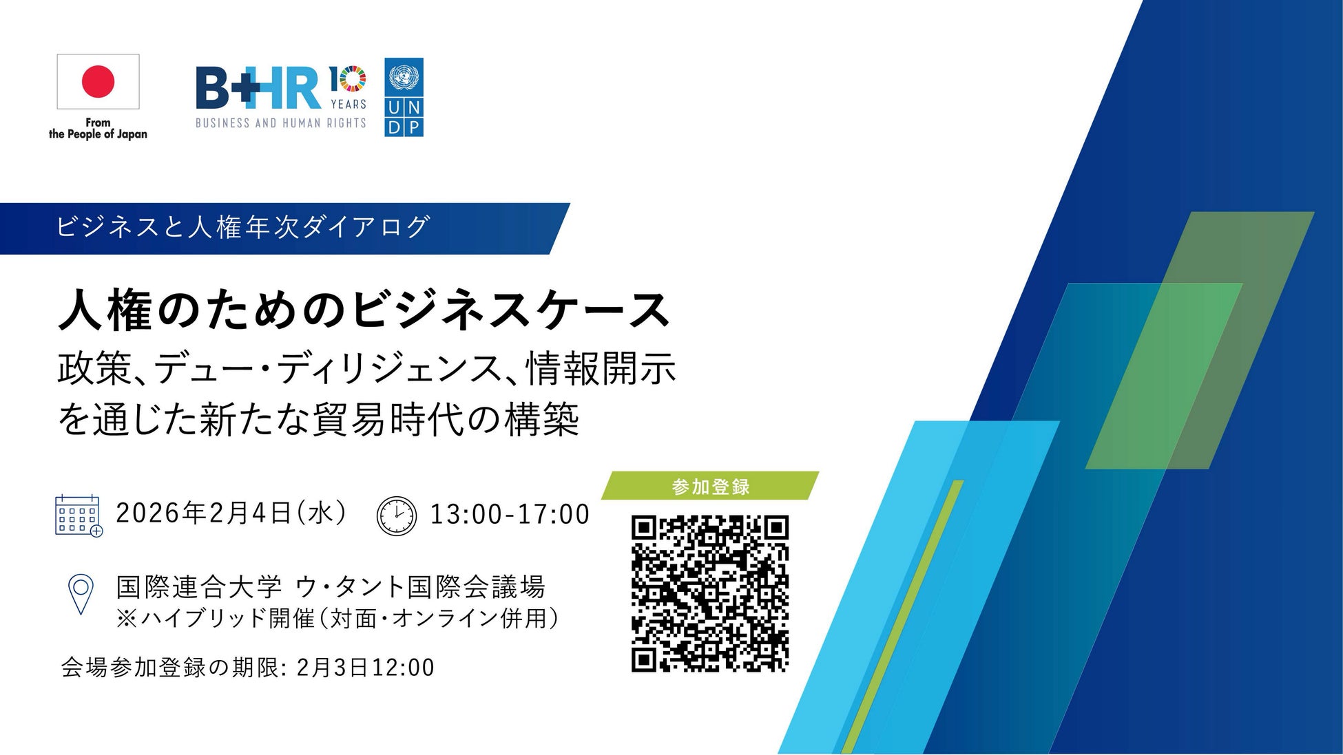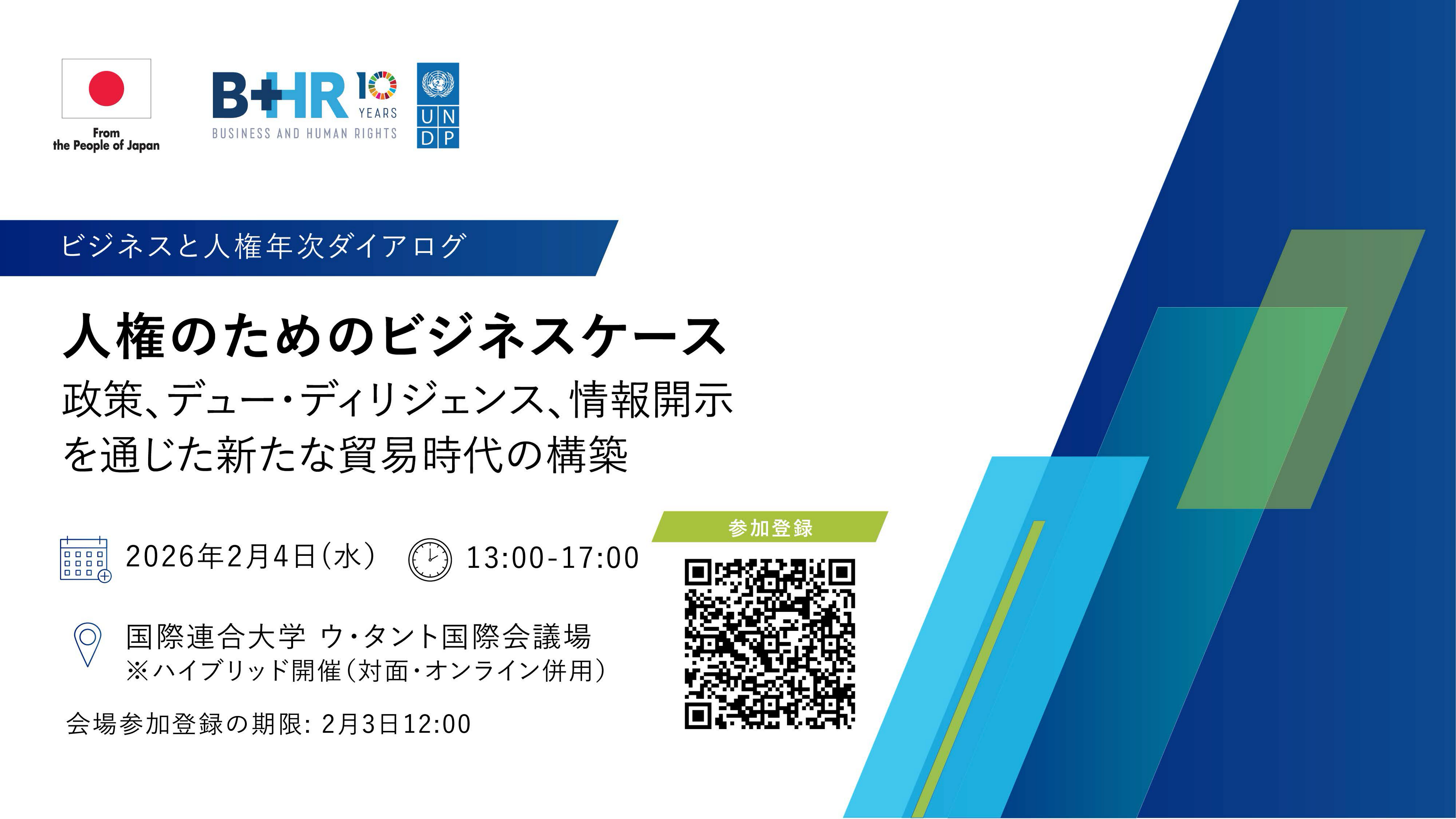 UNDPは外務省とともに、下記の通り公開イベントビジネスと人権年次ダイアログ「人権のためのビジネスケース:政策、デュー・ディリジェンス、情報開示を通じた新たな貿易時代の構築」を開催いたします。 2011年に国連ビジネスと人権に関する指導原則が承認されて以来、各国は、行動計画(NAP)や様々な立法措置を実施することで指導原則の実施に努め、それに応じて人権デュー・ディリジェンス(人権DD)を実行可能なものにしてきました。2020年10月に策定された日本のNAPは、日本国内およびより広範な国際的な規模で、ビジネスと人権に関する議論の進展に大きく貢献しており、昨年12月には改訂版NAPが公開されました。