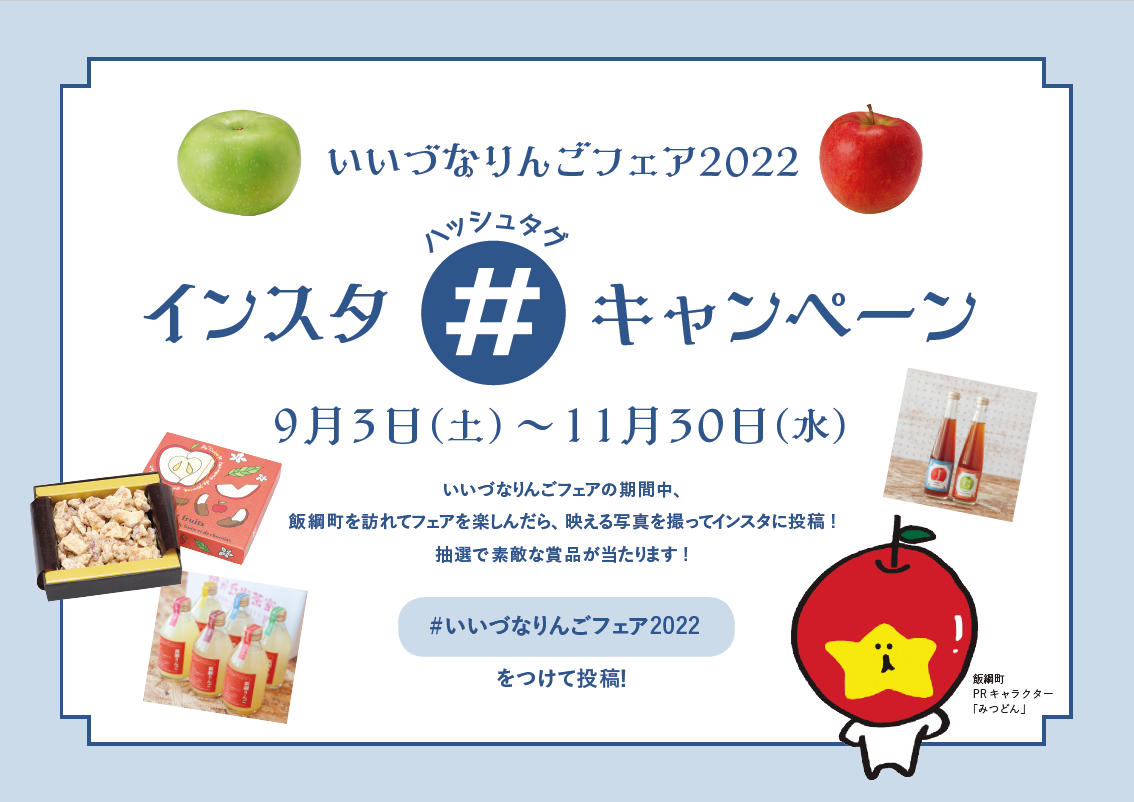 今年はさらに、「インスタ#キャンペーン」を同時開催。9月3日(土)から11月30日(水)までのいいづなりんごフェアの期間中、飯綱町でいいづなりんごフェアに関係する画像・動画を「#いいづなりんごフェア2022」をつけてインスタグラムに投稿すると、抽選で15名様に「りんごクランチショコラ」や「アップルコーラ」などが当たります。