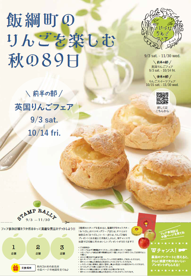 長野県飯綱町は、いいづなりんごフェアの前半の部として、9月3日(土)から10月14日(金)まで、町内の参加店舗で英国りんごを使った期間限定のメニューを味わうことができる「英国りんごフェア」を開催します。参加店舗を3カ所まわってスタンプを集めると、飯綱町PRキャラクターみつどんのマスキングテープ、ヤマとカワ珈琲店の「みつどんコーヒー」、りんごのいずれかをプレゼント。さらにWチャンスで、抽選で12名様に町のおいしいプレゼントが当たります。