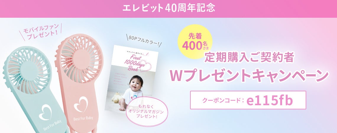 ① エレビット®ハンディファン&エレビット®マガジン「First 1000 Days Book」プレゼントキャンペーン(2024/7/11~※無くなり次第終了)