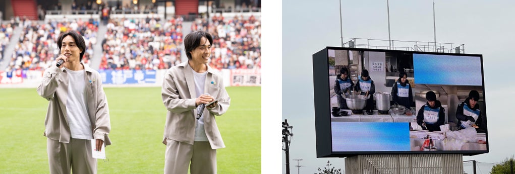 4月20日(土)に、令和6年能登半島地震 復興応援チャリティーマッチが石川県金沢市で開催され、宮本恒靖さん、中澤佑二さんら「ブルーレジェンズ」対石川県にゆかりのある選手の「がんばろう石川」の試合が行われました。ハーフタイムに【知って、肝炎プロジェクト】特別プログラムを実施し、「知って、肝炎プロジェクト」肝炎対策特別大使の伍代夏子氏と、一卵性三つ子のインフルエンサー佐藤三兄弟の綾人氏と嘉人氏が出演し、スタジアムに集まったサポーターの皆さんに向けて、「ご自身の健康を考えて、定期的な健康診断や病気の検査を受けていただきたいです。」と呼びかけを行いました。