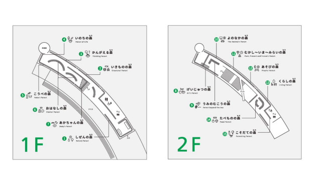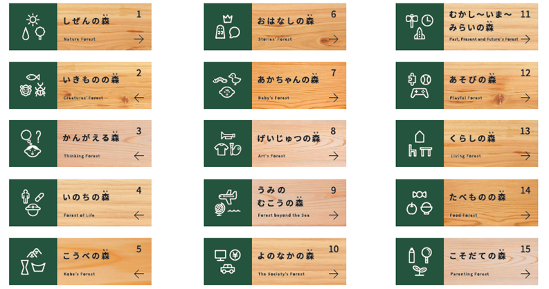 神戸オリジナルの分類として、15の大テーマを設定。イラストを使った分かりやすいサインを採用。