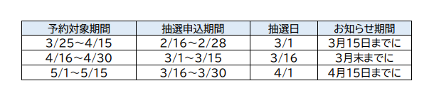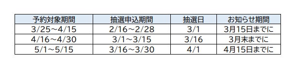 ②予約方式:抽選方式+先着予約(抽選予約確定後、キャンセル等で空きが出た場合)