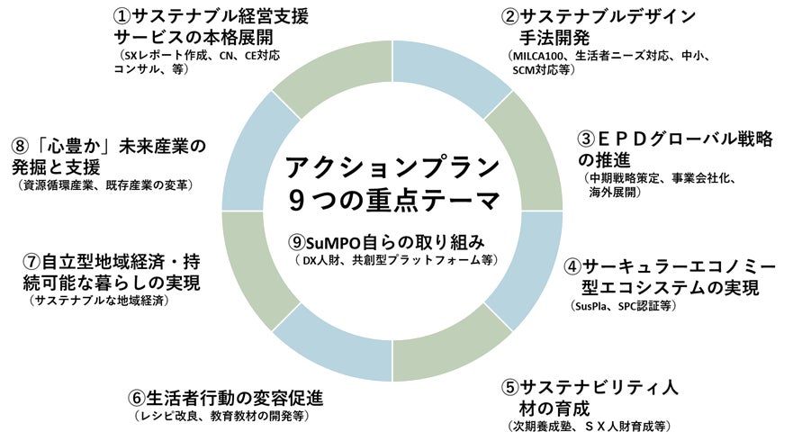 内部に設けた検討委員会では、①気候変動、②生物多様性、③持続可能な水・エネルギー、④循環型経済、⑤自立型地域経済、⑥持続可能な暮らし、⑦DX、⑧グローバルハーモナイゼーションをSuMPOとして取り上げる社会課題の視点として、個別の課題、対応方向をもとに、アクションプランの重点テーマとしてSuMPO自らの取り組みを含め9つに整理し、各テーマごとにチームを編成して具体的なアクションプランの検討を行ってきました。