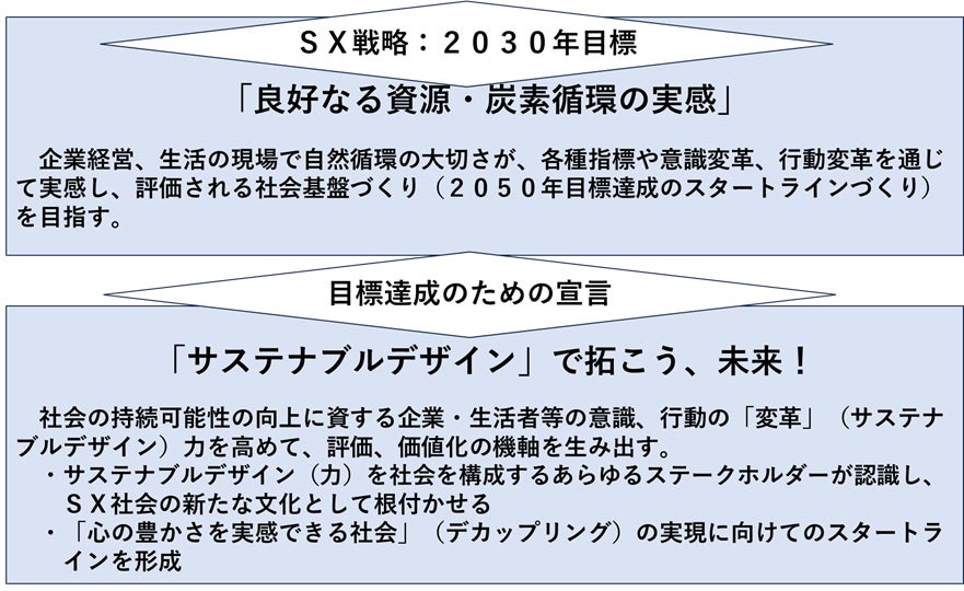 本戦略では、2050年のあるべき姿を「サステナブル完全循環社会」とイメージし、その実現のための中間目標である2030年に「良好なる資源・炭素循環を実感し、評価される社会」となるようサステナブルデザイン(社会の持続可能性の向上に資する企業・生活者等の意識・行動の「変革力」)を高めるための各種のアクションプランを実行していくこととしています。