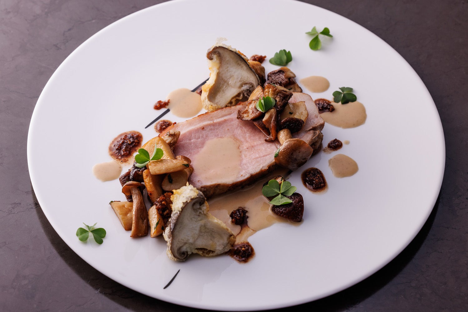 ランチコースのお肉料理「京都産もち豚の炭火焼き 季節のキノコ」では、京都産のもち豚を備長炭でじっくり香ばしく焼き上げました。香り高いポルチーニ茸のオイルと、旨味たっぷりの豚のジュを混ぜ合わせた特製ソースとともにお召し上がください。また、プラス料金(2,600円)で、樋口農園の旬の野菜10種類とともに楽しめる「国産牛サーロインの炭火焼き 季節野菜 トリュフソース」もご用意しております。炭火焼きならではの香ばしいお肉の風味と、季節の野菜の豊かな味わいをお楽しみください。