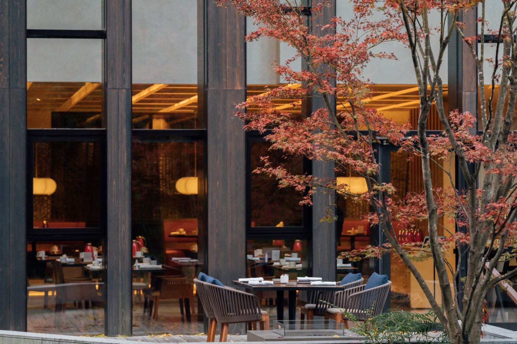 ホテル1階に位置する「ブラッスリー」は、高さ9メートルの大きな窓からその名庭を見渡し、店内にはスタイリッシュな空間が広がります。庭園を見渡すテラスを備えたその開放的なインテリアデザインは、「Kokai Studios(コカイ・スタジオ)」によって手がけられ、国際的なインテリア専門誌「INTERIOR DESIGN(インテリアデザイン)」におけるベスト・オブ・イヤーアワード、ホテルダイニング部門において2017年のショートリストに選ばれています。