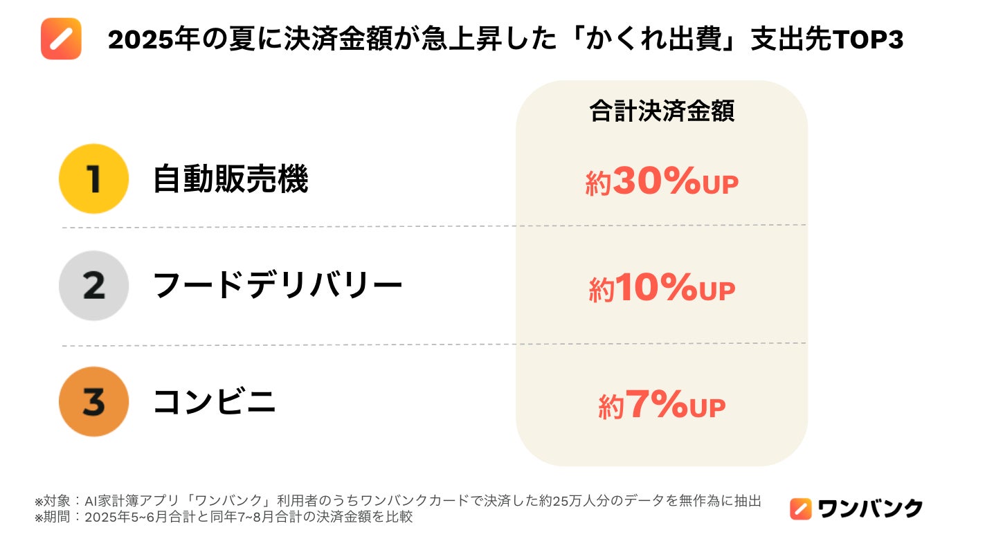 2025年9月にスマートバンクが発表した、「猛暑のかくれ出費」に関する実態調査では、今年の夏に合計決済金額が増加した「かくれ出費」の支出先1位は「自動販売機」となり、夏前と比べて約30%も増加しました。(*2)