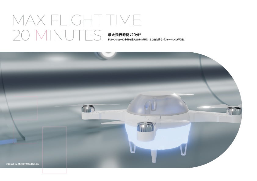 連続最大飛行時間は20分へ!機体改良とバッテリーのリニューアルを行い、事前準備と演出に十分な飛行を可能に。