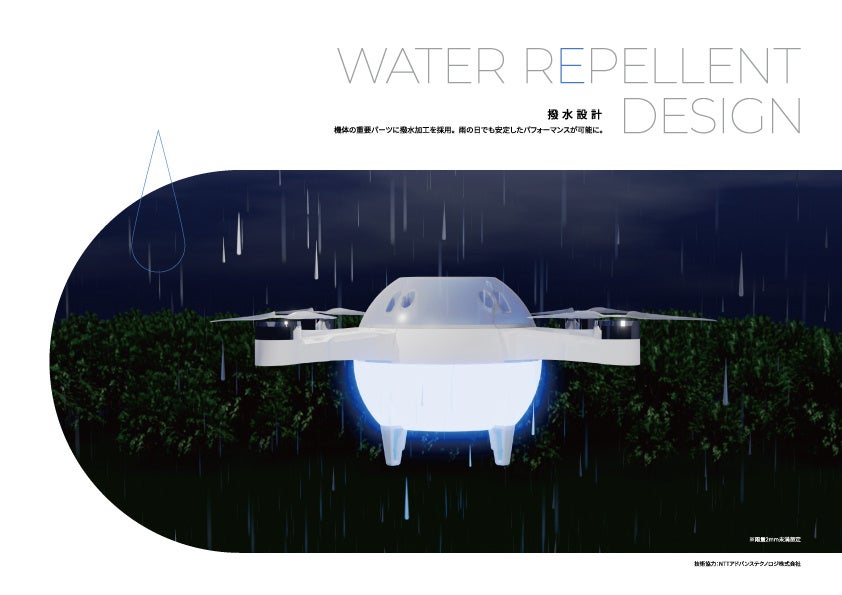 主要部品への撥水加工により、雨天時の運用にも対応。天候に左右されにくく、より安定した飛行と共に機体も保護。