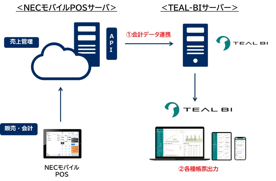 今回の連携により、NECモバイルPOSのクラウドサーバからTEAL BIのサーバへ売上データが自動で取り込みされるようになりました。