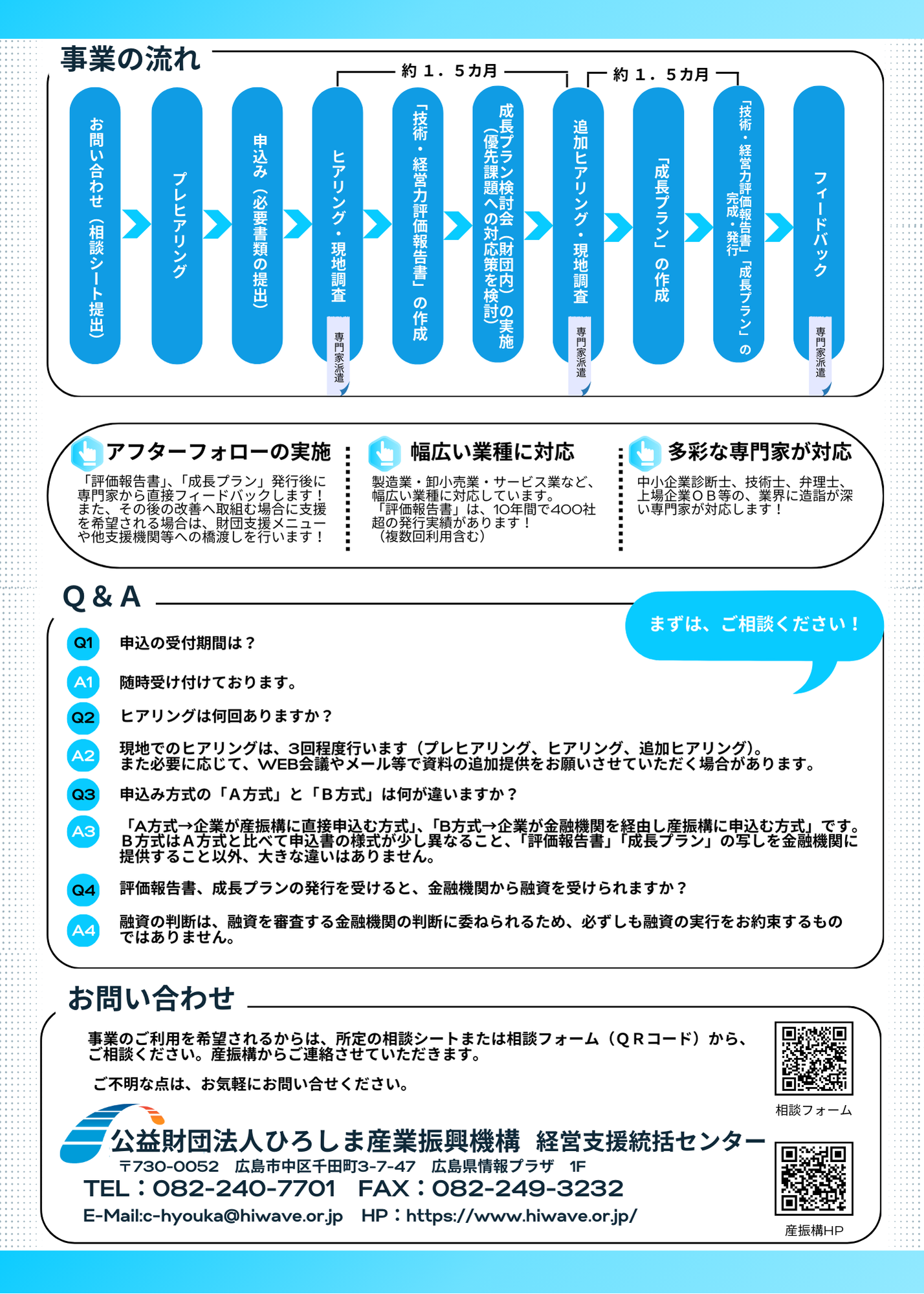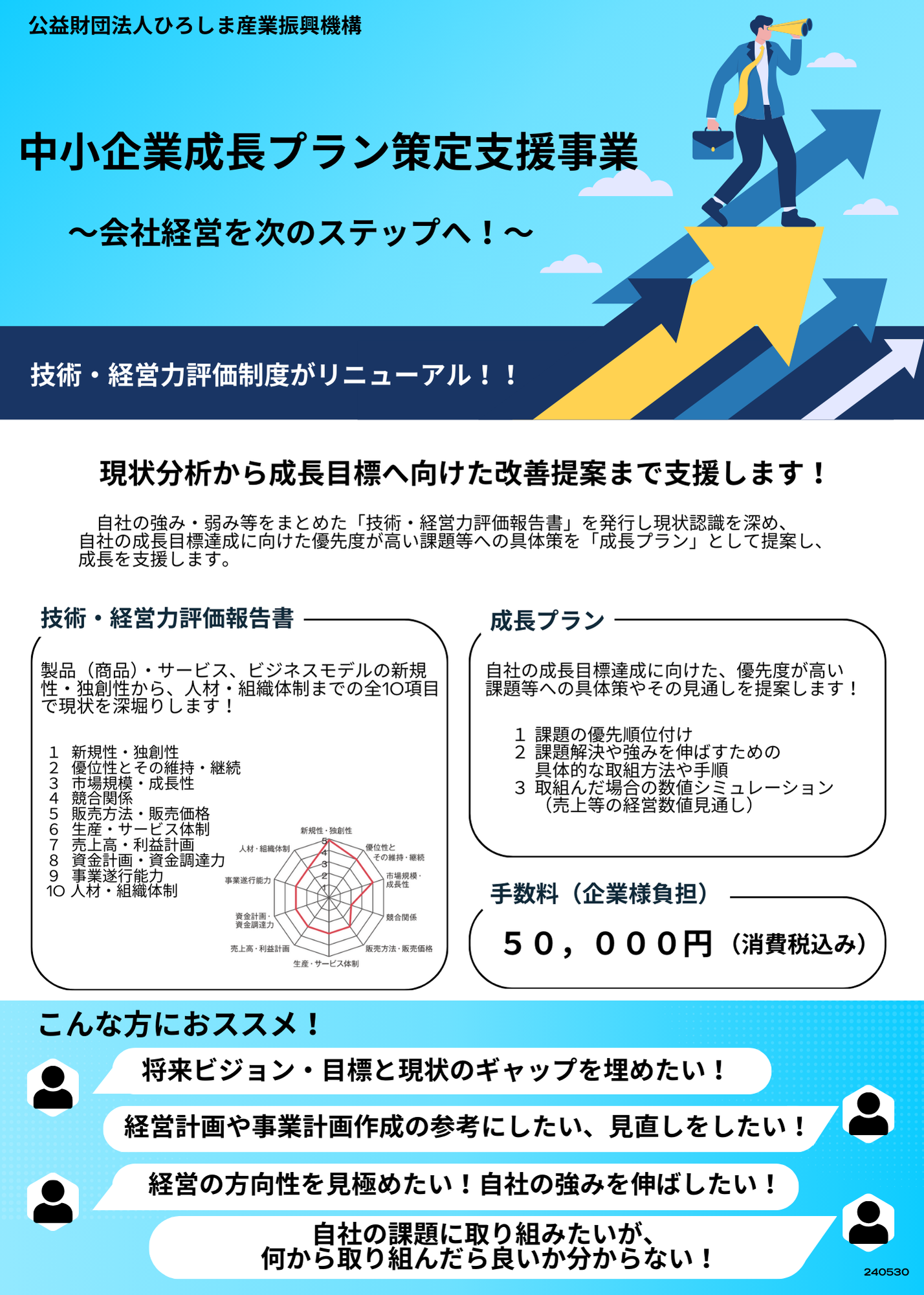 公益財団法人ひろしま産業振興機構は、平成25年度から実施してきた「広島県中小企業技術・経営力評価制度」をリニューアルし、今年度から「中小企業成長プラン策定支援事業」を実施します。本事業では、企業の強み・弱み等をまとめた「技術・経営力評価報告書」を発行し現状認識を深めるとともに、新たに、企業の成長目標達成に向けた優先度が高い課題等への具体策を「成長プラン」として提案し、県内中小企業の成長を支援します。