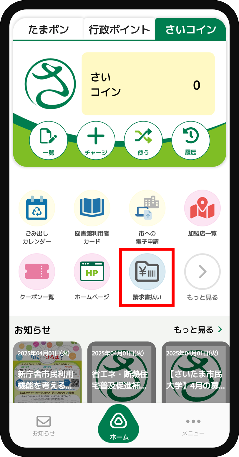 「請求書払い」ではさいコインのみご利用可能です。(たまポンや行政ポイント等はご利用不可)