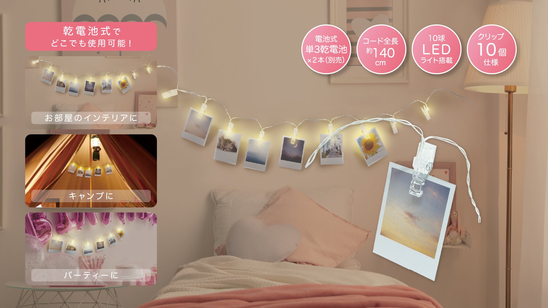 特徴:お気に入りの写真やカードを挟んで、お部屋をより素敵に演出してくれる「クリップストリングライト」。クリップ部分が優しく光って、とってもロマンティック♪乾電池式だからどこでも使えます。パーティシーンやキャンプ、グランピングにもオススメ!素敵な空間を作りたい時にピッタリなアイテムです。