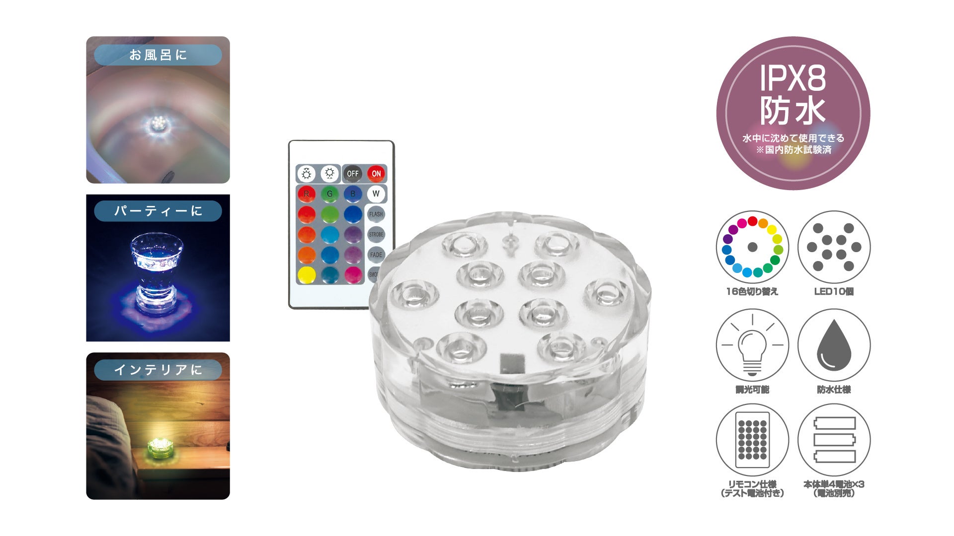 特徴:いつものバスタイムが、よりステキに、より癒されタイムになるイルミネーションライト。レインボーカラーに光り、バスライトやインテリアに使えば、幻想的な空間に早がわり♪水中に沈めても使えます!ライトは7段階の調光と選べる16色。毎日のバスタイムに、さらに癒しの空間を演出してくれます♪