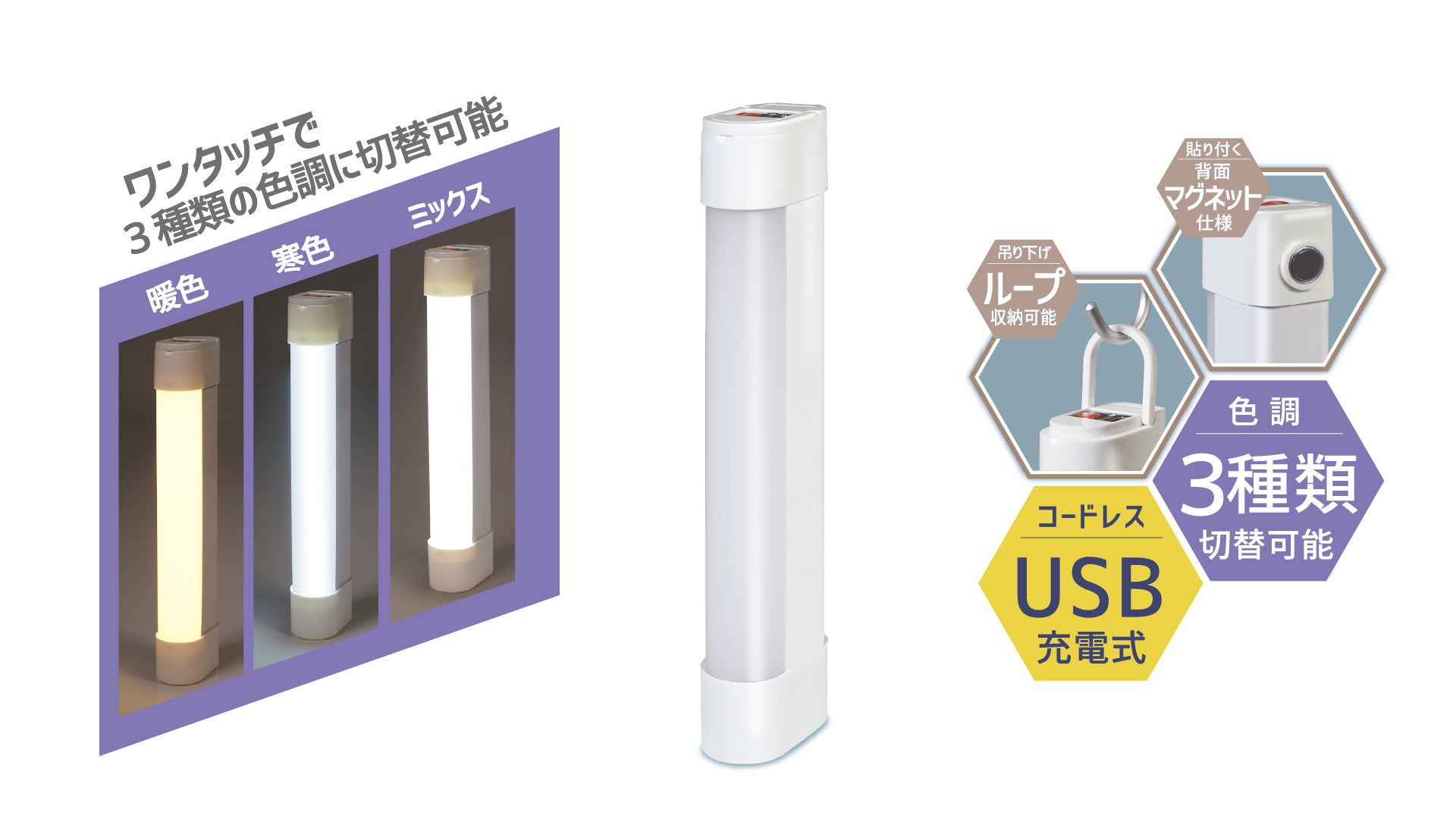 特徴:吊り下げ・スタンド・ハンディの3wayで使えるチャージ式ライト。裏面はマグネットが付いていて、車や物置などにパチっとくっつけられるから、夜に作業する時に大活躍!吊り下げループも付いているので、玄関やベランダなどちょっとした所に引っ掛けられるのも便利♪暖色・寒色・ミックスの3段階に調節可能です。