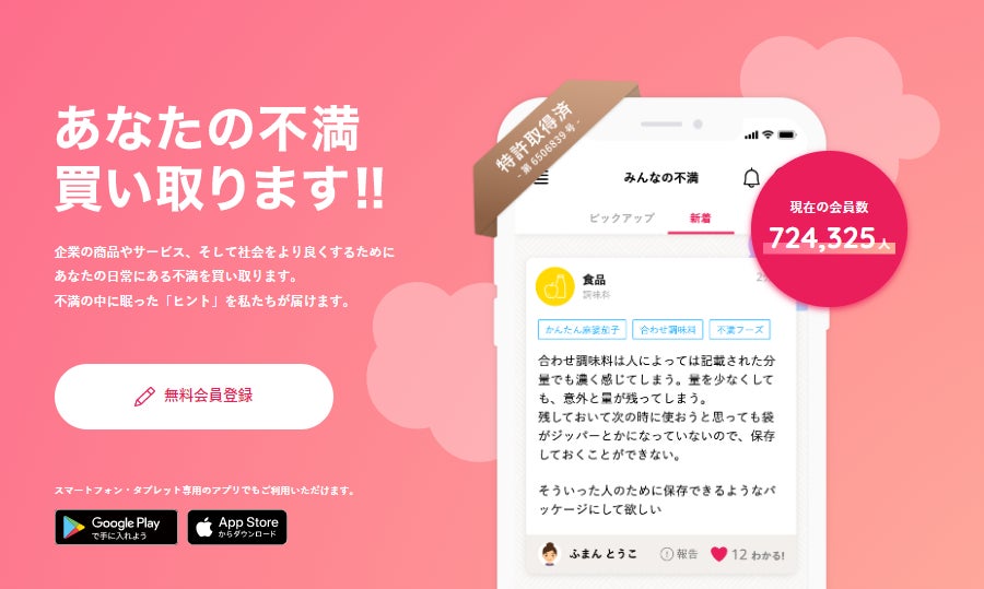 不満買取センター(特許取得済み)は、「企業の商品やサービス、そして社会をより良くするために、あなたの不満を買い取ります。あなたの不満の中に眠った”ヒント”を私たちが企業や社会に届けます」をコンセプトに、2015年3月18日からサービス開始をしております。Webサービス及びスマートフォンアプリを通して生活者からの不満の声を収集しており、現在累計72万人以上の会員から、累計3,500万件以上の不満を買い取っています。