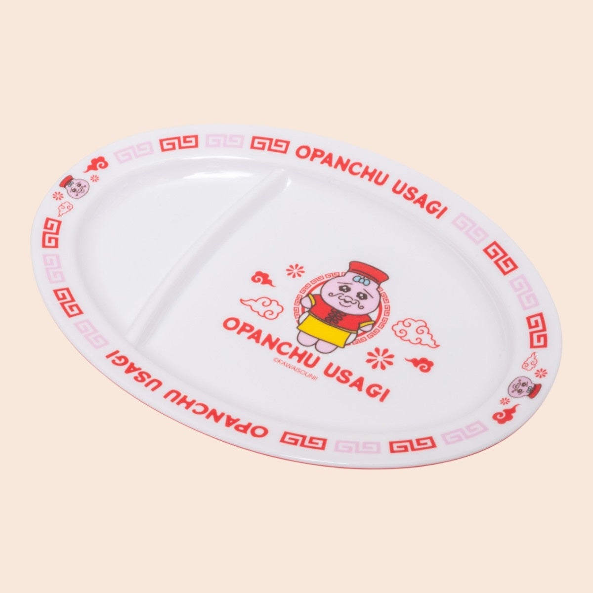 仕切り付きの楽円形ギョーザ皿です。餃子とタレを分けて盛り付けられます。中央には中華帽を被った「おぱんちゅうさぎ」が描かれ、餃子パーティーを盛り上げます。