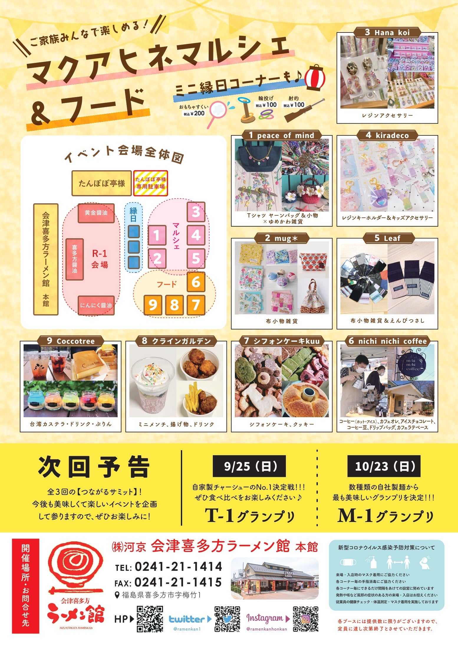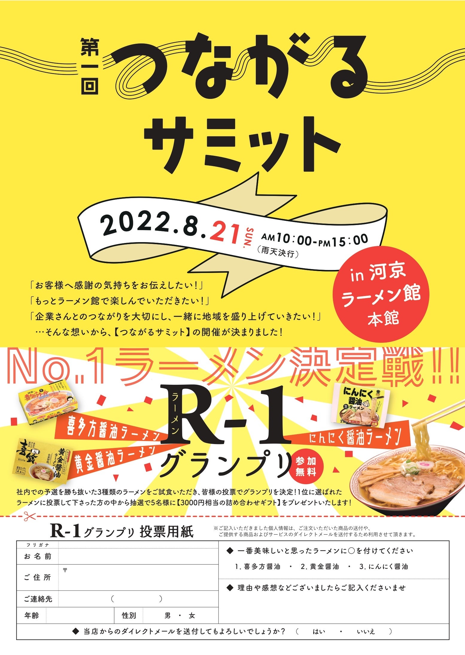 株式会社河京 会津喜多方ラーメン館本館(本社:福島県喜多方市、代表取締役:佐藤富次郎)は、社内での予選を勝ち抜いた3種類のラーメンの試食と人気投票を行うR-1グランプリ、地元喜多方・会津を中心に活動しているハンドメイド販売・フード販売の「マクアヒネマルシェ」の開催、ミニ縁日などを行う「つながるサミット」を2022年8月21日(日)に開催致します。