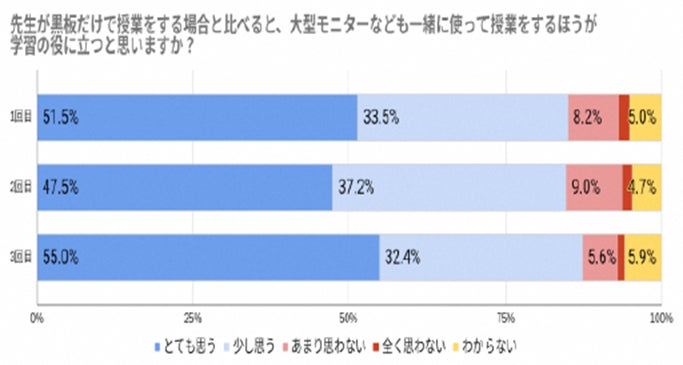 また、黒板だけの授業だけでなく、ICT機器を使うことが、学習に役立つと考える生徒が87%以上、学校に自身専用のICT端末があると学習に役立つと感じている生徒が89%以上を占めており、ICTの活用が学習効率を高めると考える生徒がかなり多いことも分かりました。