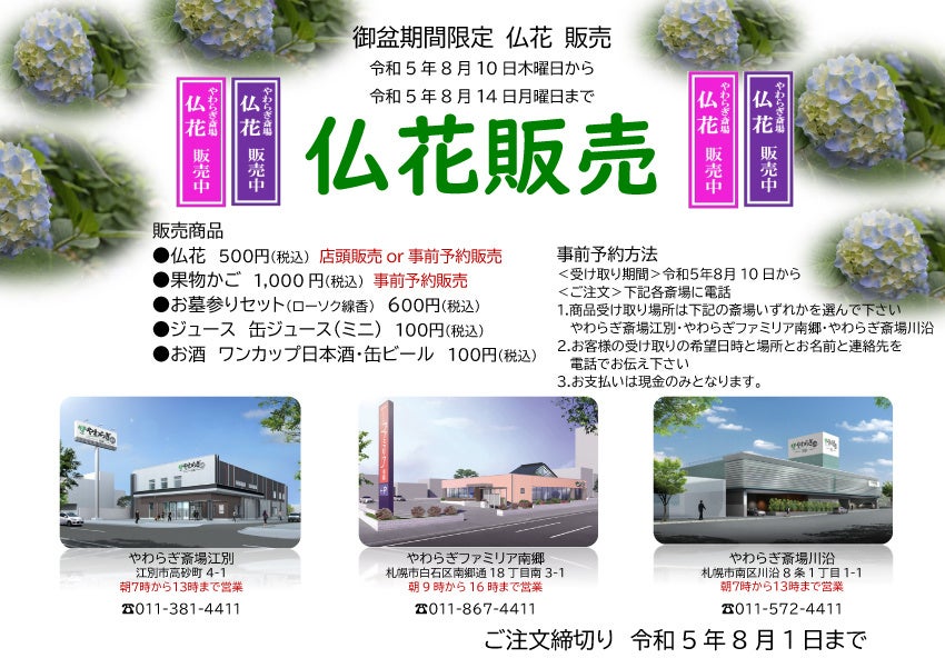 やわらぎ斎場では8月10日から14日までのお盆の期間に、やわらぎ斎場江別、やわらぎファミリア南郷、やわらぎ斎場川沿の3つの斎場で仏花販売を行います。