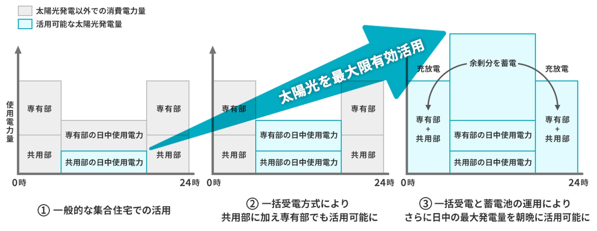 しかし、本プロジェクトでは一括受電方式を採用するため、専有部も含めた建物全体で電力を利用することが可能になります(図-②)。さらに、蓄電池を活用することで発電量の多い日中以外にも電力を使用することができます。これにより、屋根面積を最大限に活用した再エネ自家消費率の向上にも貢献できます(図-③)。