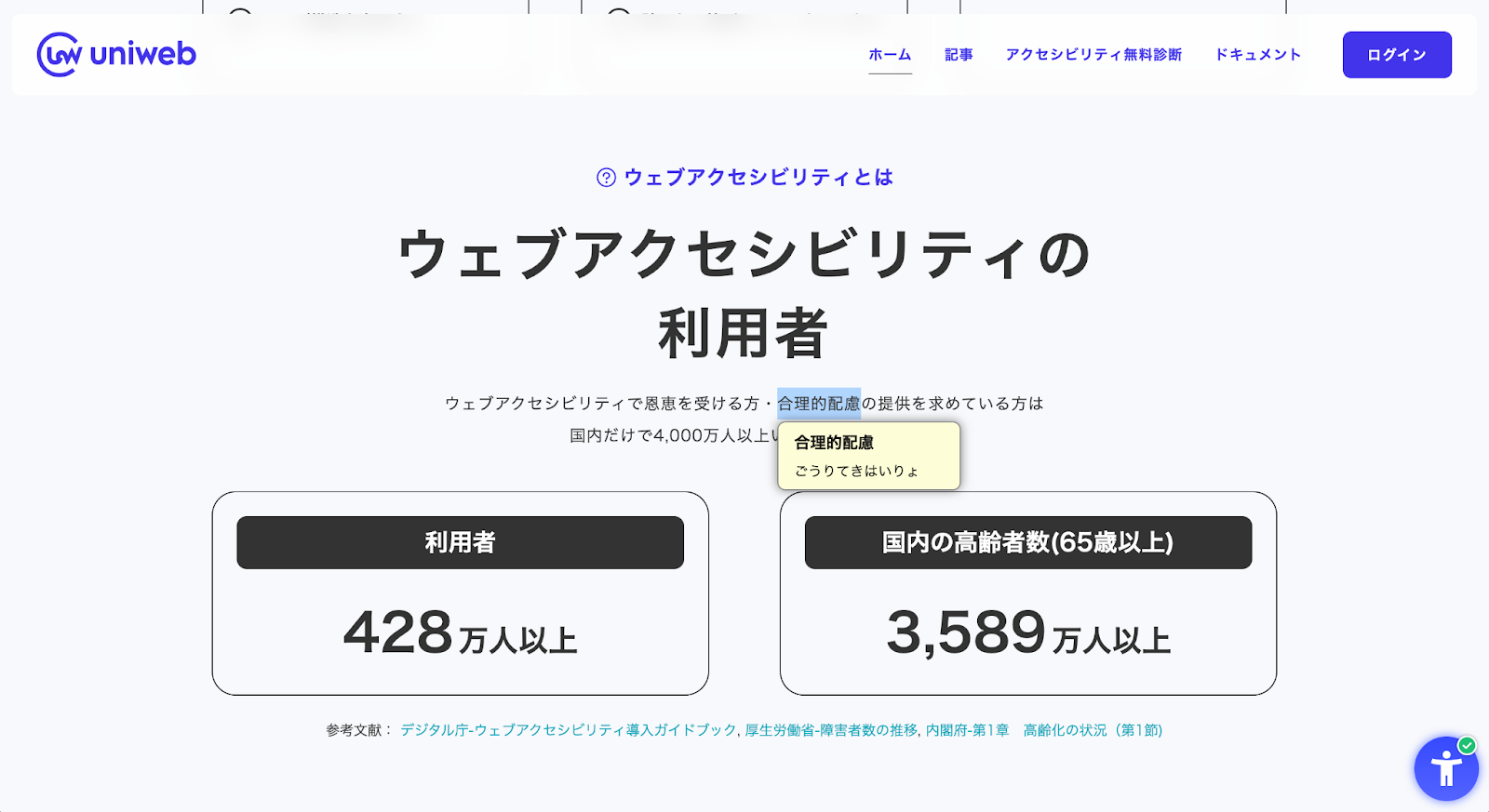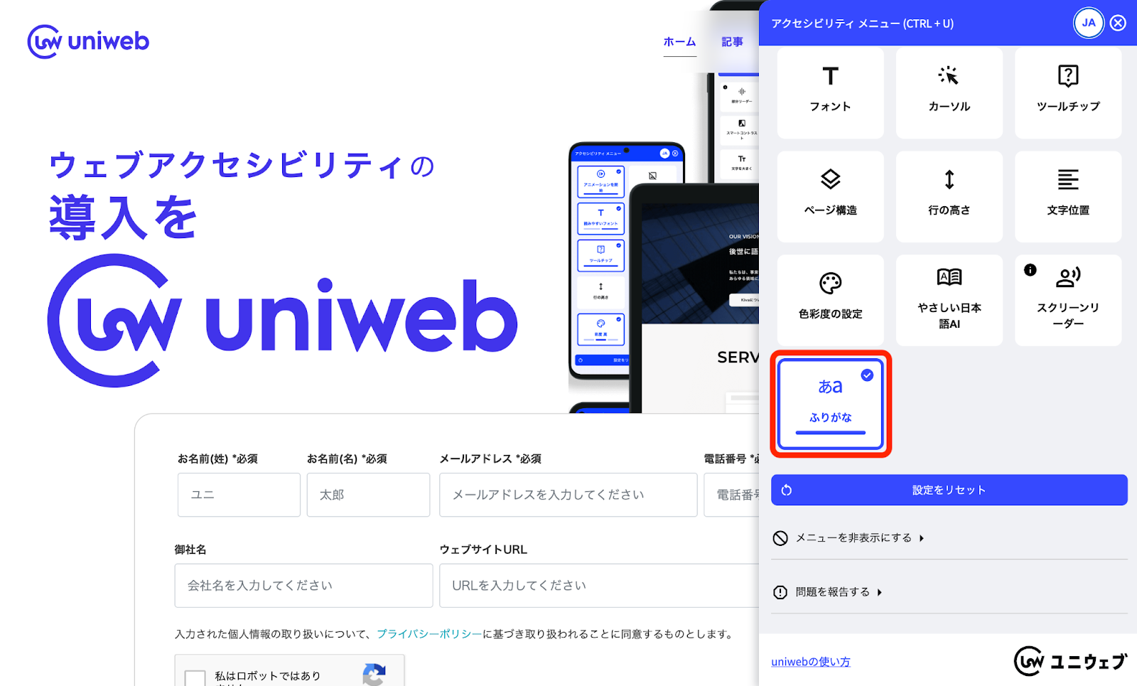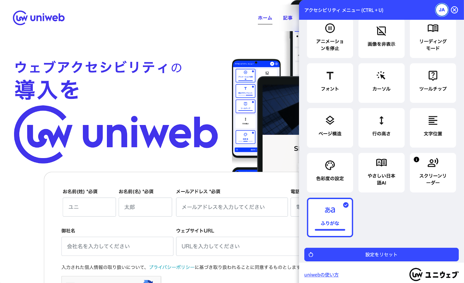 ユニウェブは、すべてのウェブサービスにコード一行を追加するだけで「導入当日」にウェブアクセシビリティ機能をサポートします。