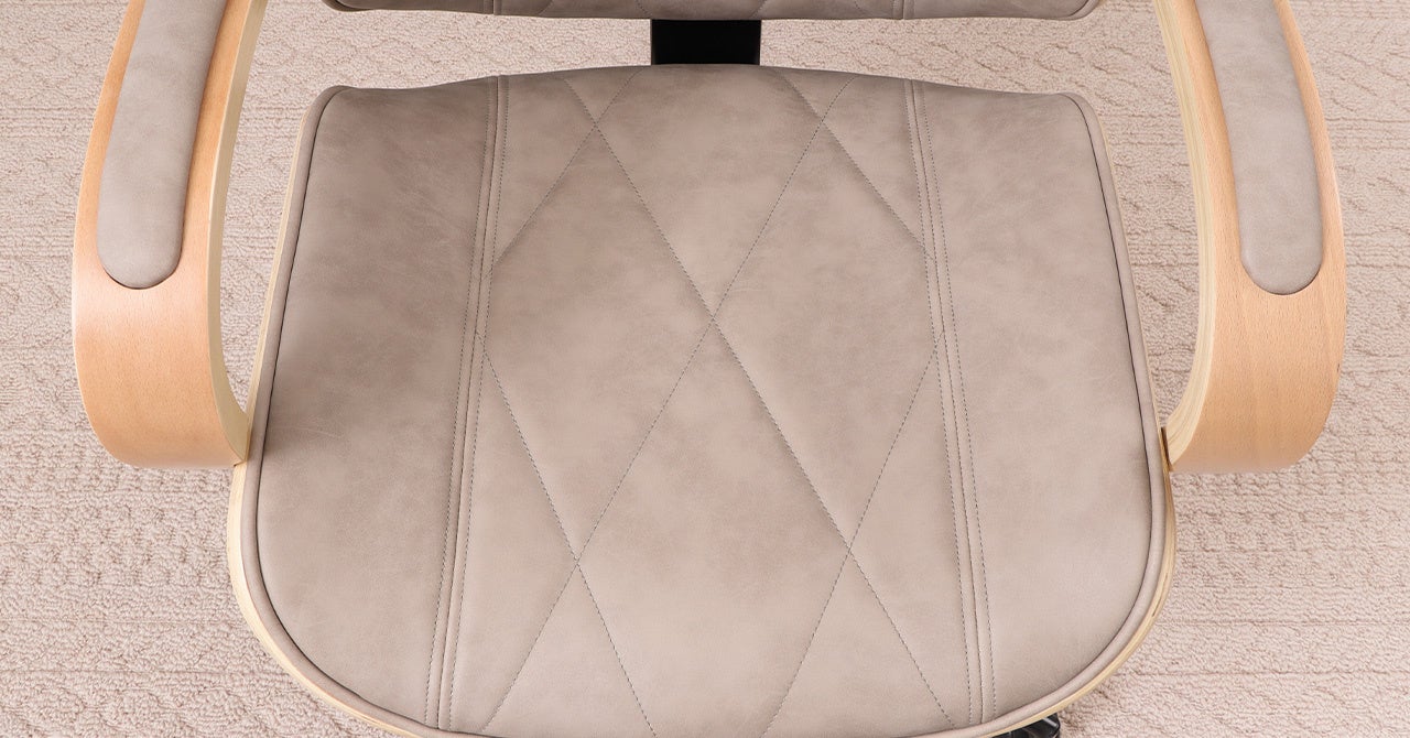 chaine-(シェンヌ)のデザインの最大の特徴となっている曲面状に形作られたシートは、薄くスライスした木材を一枚ずつ重ねて接着させ、熱を加えながら型にはめ曲面状に形作った木工技術です。その緩やかな曲線を描くシートの内側は、柔らかな肌触りの合成皮革の下にウレタンを張り込み、弾力ある優しい座り心地となっています。前と後ろで印象がガラッと異なるところも魅力。