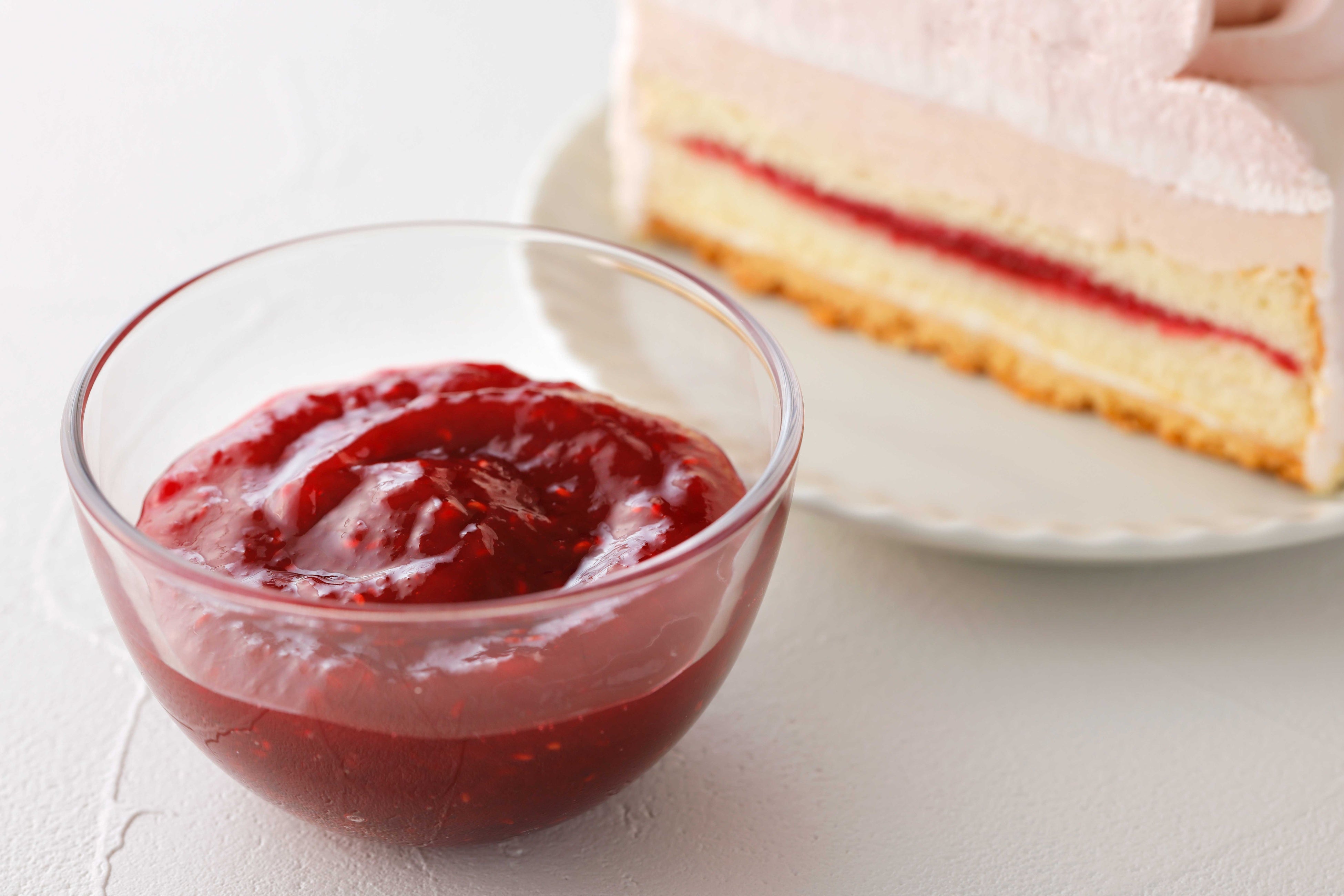 自家製のフランボワーズジャムを卵の比率が高くしっとりふわふわ食感のスポンジ生地でサンド。