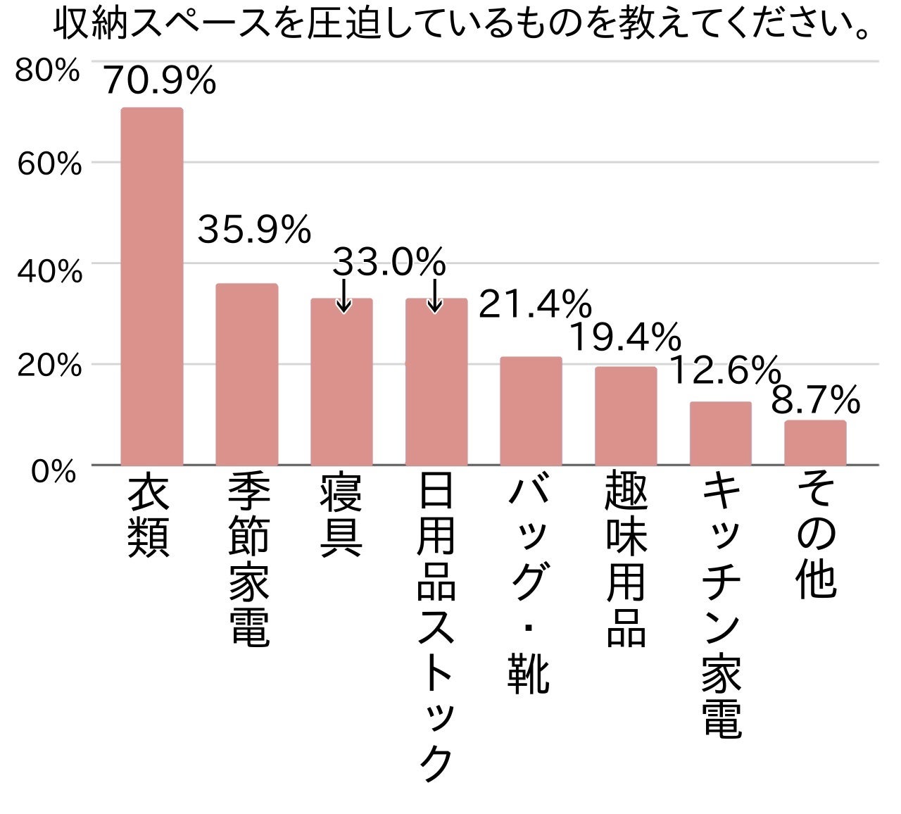 アンケートでは次に、収納スペースが不足していると答えた方を対象に、収納スペースを圧迫しているものは何かを尋ねてみました。