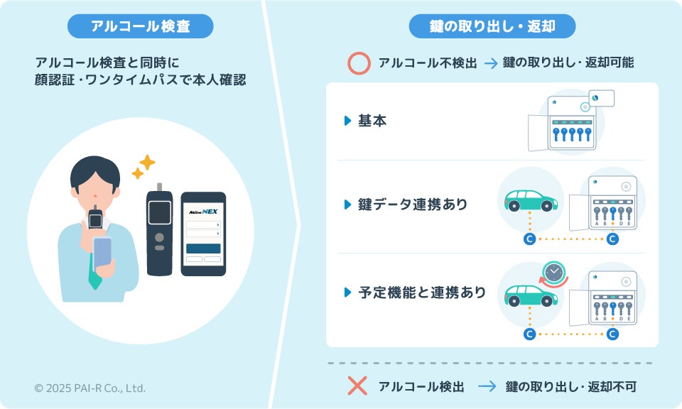 株式会社パイ・アール(本社:大阪市中央区、代表取締役:安田 功)は、白ナンバー向けアルコールチェックシステムでシェアNo.1※ を誇る「アルキラーNEX」と株式会社クマヒラ(本社:東京都中央区、代表取締役社長:渡邉 秀隆 )のクラウド型鍵管理サービス「SPLATS KEY」は、連携をさらに強化し、2025年3月24日より追加連携機能を提供開始いたします。