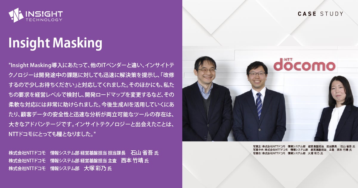 株式会社インサイトテクノロジー(本社所在地:東京都渋谷区、代表取締役社長 CEO:森田 俊哉、以下:インサイトテクノロジー)は、株式会社NTTドコモ(本社所在地:東京都千代田区、代表取締役社長:前田 義晃、以下:NTTドコモ)が個人情報を保護しながらリモートワークでデータ分析ができる体制を構築するにあたり、自社開発のデータマスキングソフトウェア「Insight Masking」が導入されたことをお知らせします。