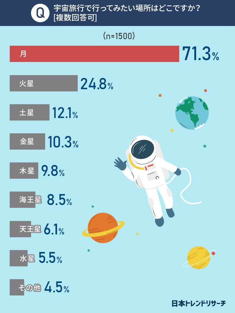 そこで今回は、事前調査で「宇宙旅行で行きたい場所がある」と回答した全国の男女1,500名を対象に「宇宙旅行」についてアンケートを実施しました。