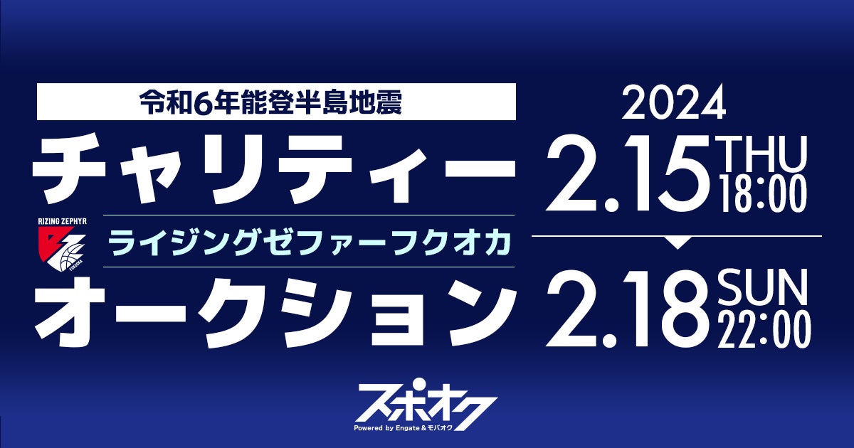 株式会社モバオク(本社:東京都渋谷区、代表取締役社長:生田目 知之、以下モバオク)がエンゲート株式会社(本社:東京都中央区、代表取締役:城⼾ 幸⼀郎、以下エンゲート)と業務提携し提供するスポーツチーム公式オークションサービス「スポオク」は、B.LEAGUE所属のライジングゼファーフクオカが実施する「ライジングゼファーフクオカ 令和6年能登半島地震 チャリティーオークション」を2024年2月15日(木)から開催中です。
