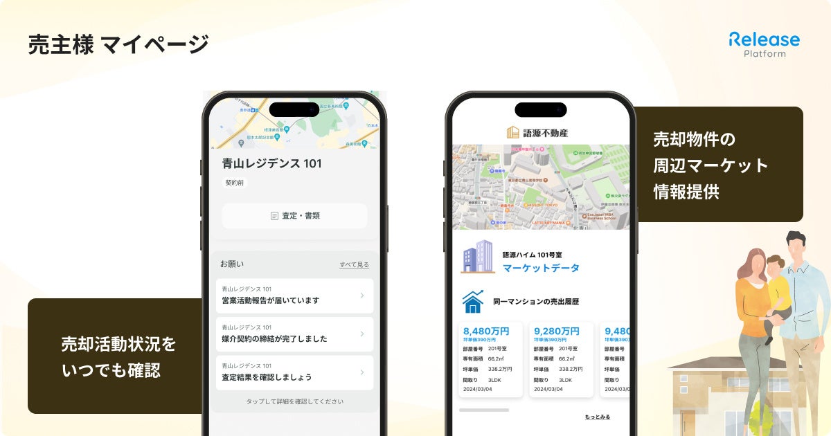 レリーズプラトフォームの手続き基盤を使用し、案件管理、媒介契約の作成から電子契約手続き、営業活動報告書の作成・提出、売主への書類共有をレリーズプラットフォームの管理画面から行うことができます。媒介業務のデジタル化により業務効率を大幅に向上させ、ペーパーレス化による郵送代などのコスト削減を実現します。また、売主との書類やメッセージのやり取りは、専用の「マイページ」を通して行うことができるためコミュニケーションの一元化ができ、顧客満足度の向上にも寄与します。売却完了後もマイページを通して売主への定期的なコミュニケーションを図ることで、紹介案件の獲得など売上向上にもつながります。