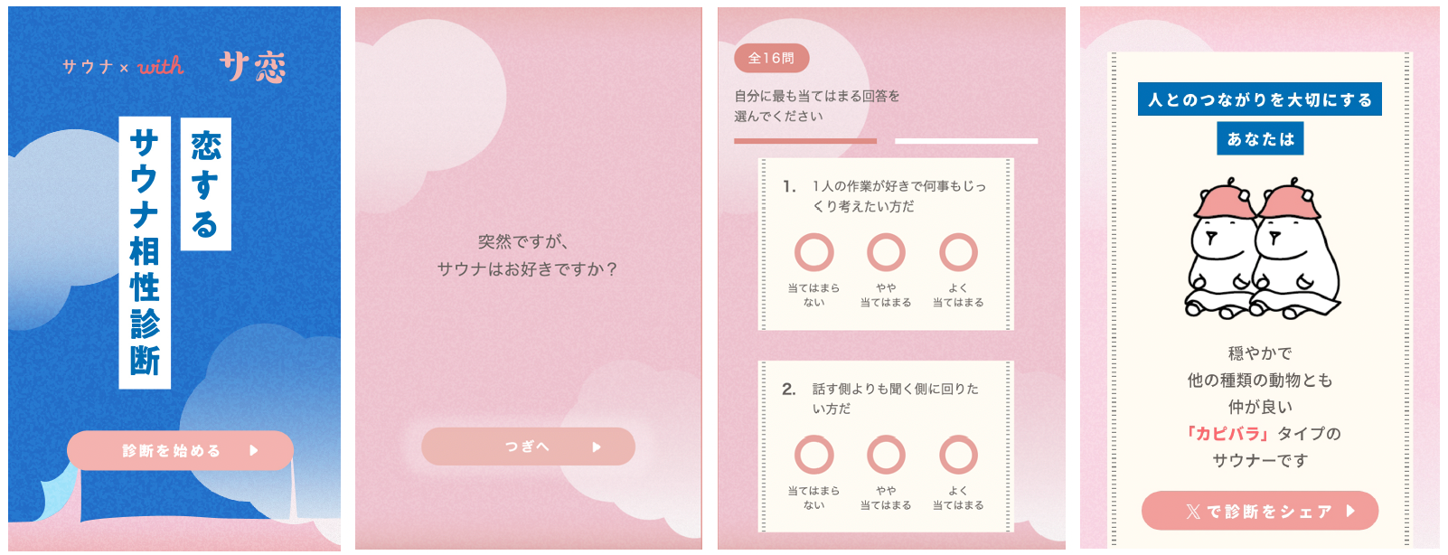 『with』は、統計学×心理学により自身に合った最適なパートナーを探せるサービスをめざしており、「心理テスト」で深層心理までを含めたマッチングを可能としています。今回の「恋するサウナ相性診断」では、16個の質問に回答いただき、動物をモチーフにした4つのサウナータイプに分類します。サウナ体験から導き出される恋愛診断で相性の良いお相手を探していきましょう。