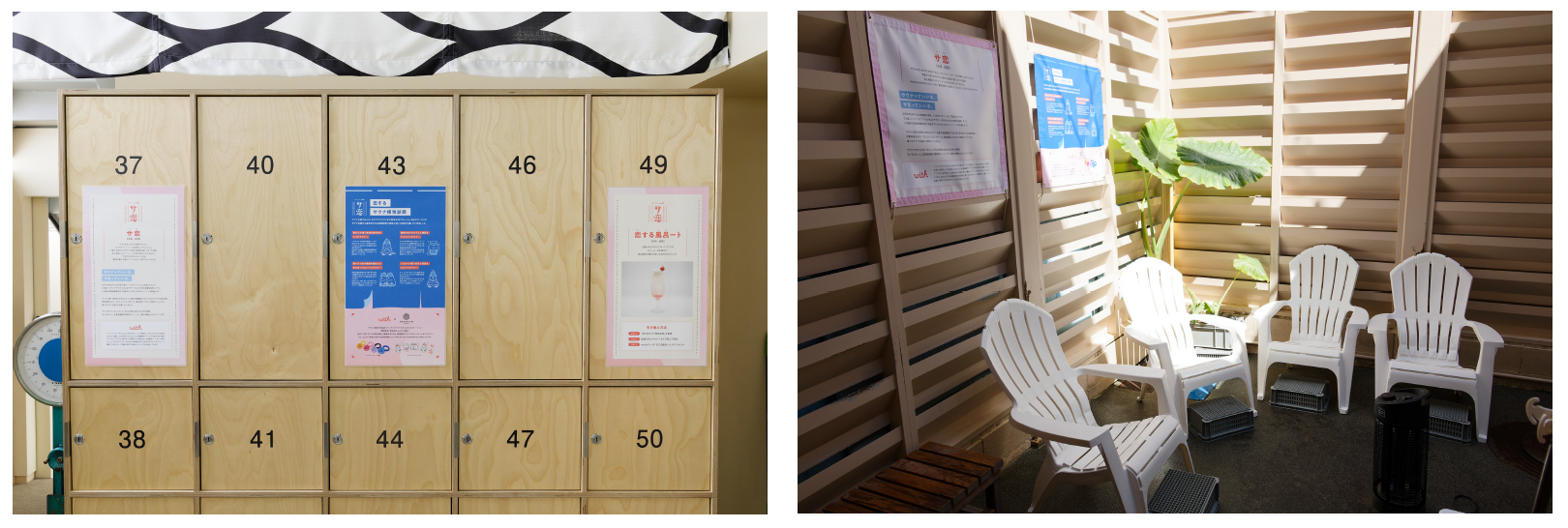 館内装飾が『with』仕様になるほか、「恋するサウナ相性診断」の診断結果提示でもらえるタイプ別の無料ノベルティや、診断を受けた2人が同じ診断結果だともらえる限定フロート「恋する風呂ート」、その他、サウナに入りながら音楽が聴ける「聴くサウナ」では、恋愛ソングを中心とした『with』仕様のプレイリストをお楽しみください。また、浴室内にある薬湯も「サ恋の湯」として『with』カラーに染まるなど、様々な仕掛けをご用意しています。
