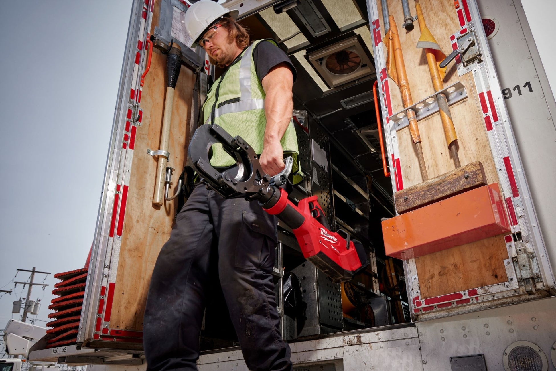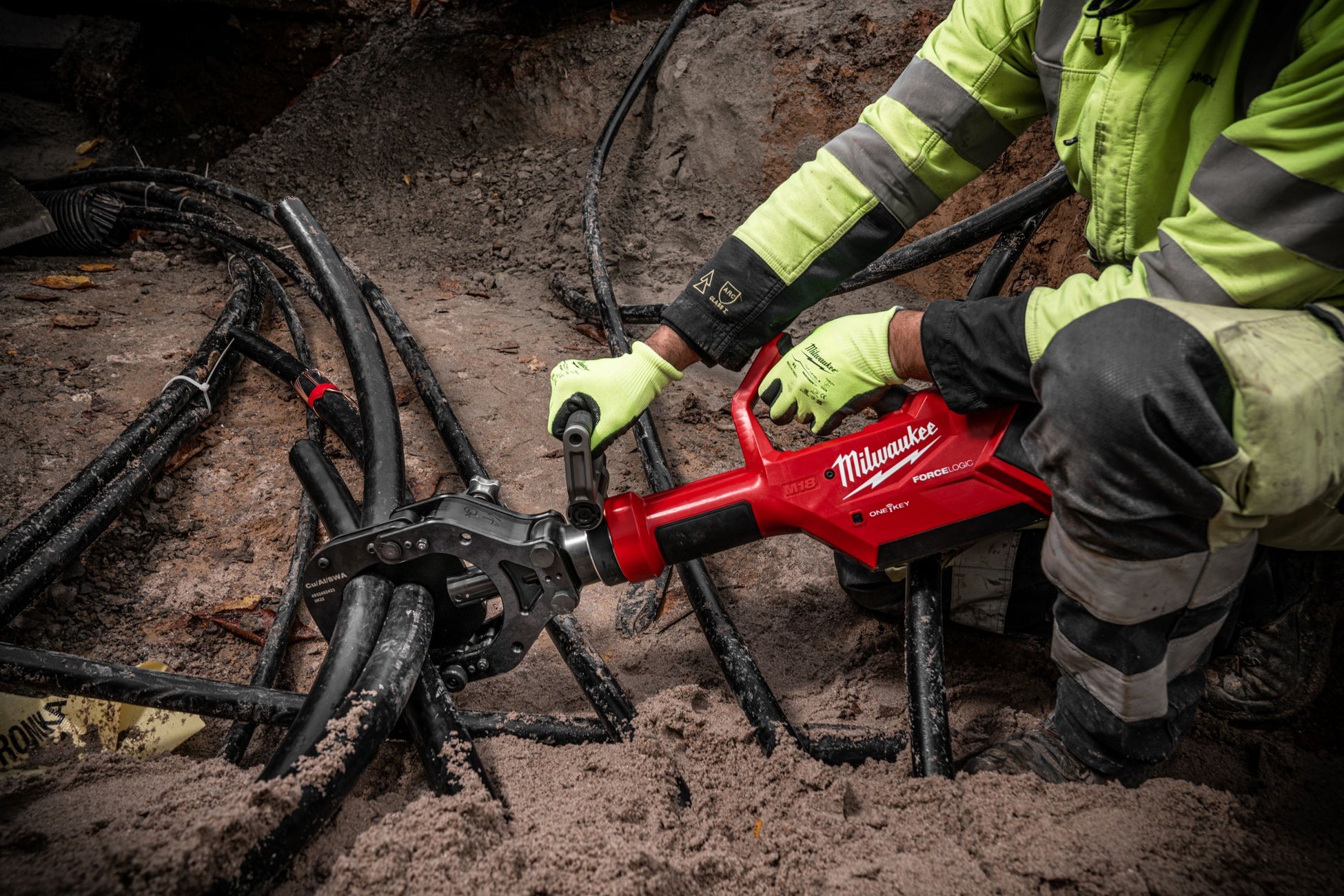 最大125mmのCu/Alケーブル切断能力で、地中送電、変電所、地中配電などの電力設備、通信事業者やデータセンター等での作業に対応「M18 FORCE LOGIC 125mm電動油圧式電線カッター」