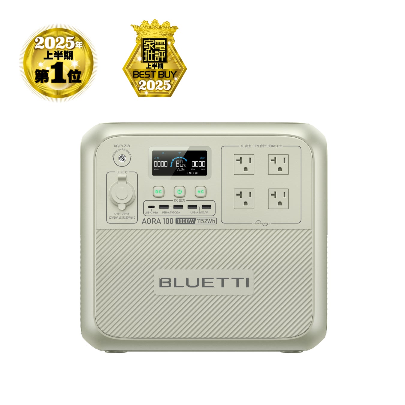 1,152Whの大容量と1,800W(電力リフトモード時2,700W)の高出力を誇るBLUETTI AORA 100。直感的な日本語インターフェースと大型ディスプレイにより、幅広い年齢層が安心して使用できる設計が特徴です。家電製品専門誌『家電批評』5月号にてBest Buy第1位に選定されるなど、その信頼性と性能が高く評価されています。