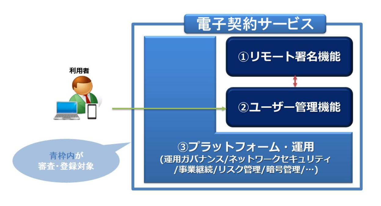 本制度は、下記3つの対象領域を中心に、なりすまし防止や電子署名等の固有性、長期にわたる検証性などの観点から電子契約サービスの信頼性を評価・登録する枠組みです。