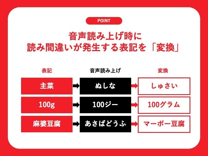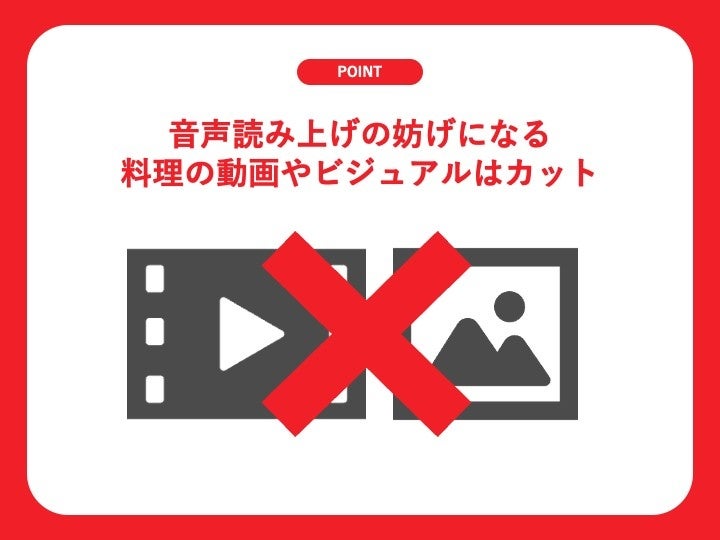 視覚障がい者の方々は、スマートフォンやPCの「音声読み上げ機能」を活用して、Webサイトの情報にアクセスすることができます。しかし、通常のサイトは晴眼者向けに設計されているため、あらゆるテキスト情報を一通り聴かなければ、肝心のレシピ情報にたどり着くことが難しい状況です。また、音声読み上げに対応していない画像は、ノイズとなってしまいます。そこで今回は、音声読み上げを前提としたUI/UX設計に挑戦しました。読み上げの妨げとなる文字や画像は排除し、必要な情報に最短でアクセスできるよう工夫しました。さらに、読み間違いが発生する文字を変換するなど(例: “g”は音声読み上げで”ジー”と読まれるため、”100g”を”100グラム”に変換)、詳細なルールを設定し、既存のレシピを見直しました。