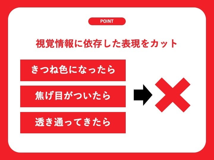 一般的なレシピには、視覚情報に依存した表現が多く含まれています。たとえば、「きつね色になったら」や「焦げ目がついたら」といった表現は、視覚障がい者の方々にとっては理解が難しい障壁となります。「SOUNDFUL RECIPE」では、これらの視覚に依存する言葉を、目が見えなくても理解できる表現に変換しました。その結果、晴眼者にとってもわかりやすいレシピへとアップデートされました。また、一部のレシピには盛り付け方法も紹介しています。写真を見なくても盛り付け方法が理解でき、料理のおいしさが伝わる工夫を施しています。