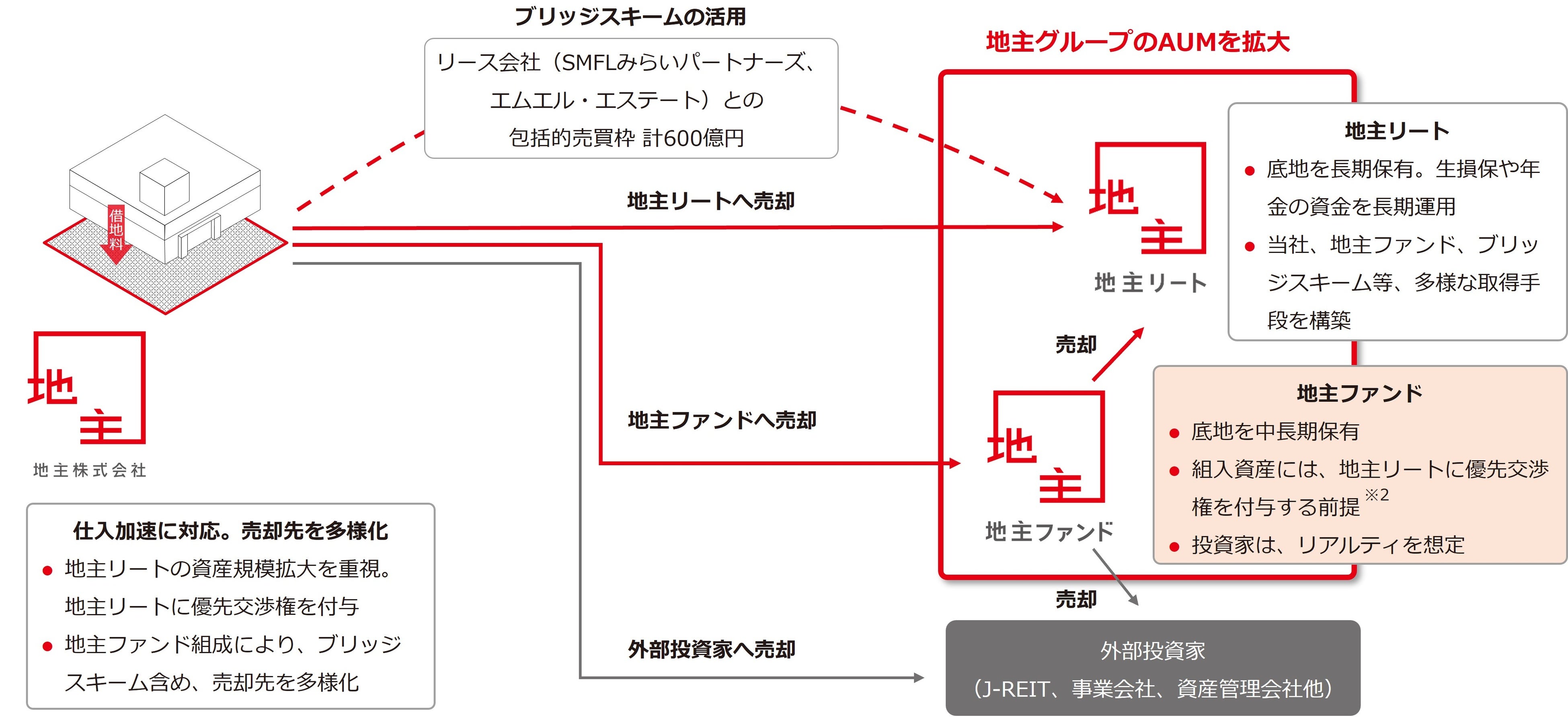 当社は、投資家からの強い需要を獲得し続ける地主リート及び地主リートへの優先交渉権を付与したリース会社とのブリッジスキームに加えて、「地主ファンド」の活用により、バランスシートをマネジメントしながら、更なる仕入の拡大及び持続的な利益成長を目指してまいります。