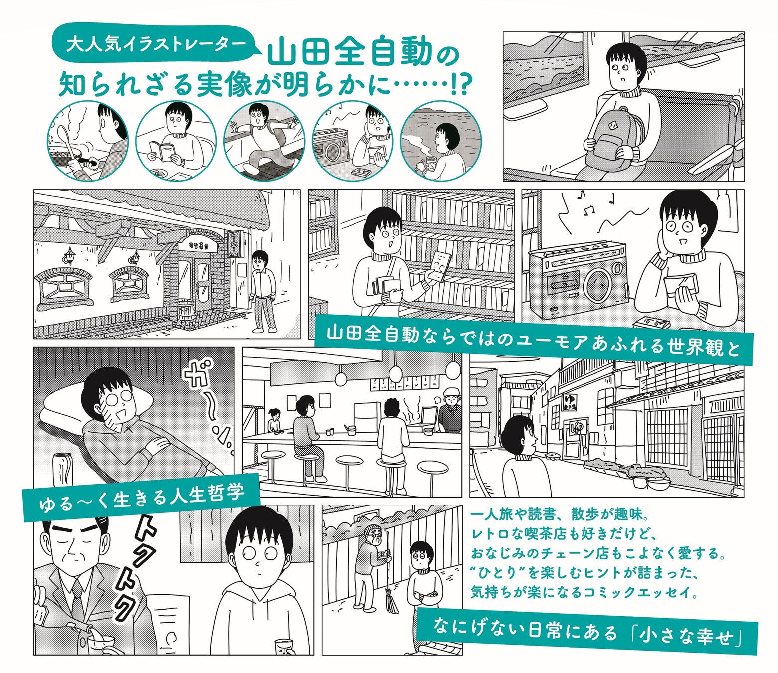 山田全自動ならではのユーモアあふれる世界観とゆる~く生きる人生哲学、なにげない日常にある「小さな幸せ」が描かれています。