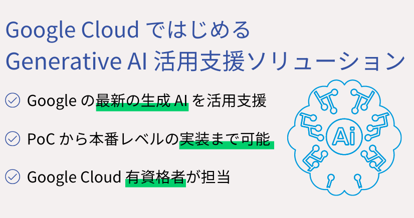 Google の Generative AI (生成 AI) の活用を、Google Cloud 専業インテグレーター G-gen のエンジニアが技術支援するソリューションです。