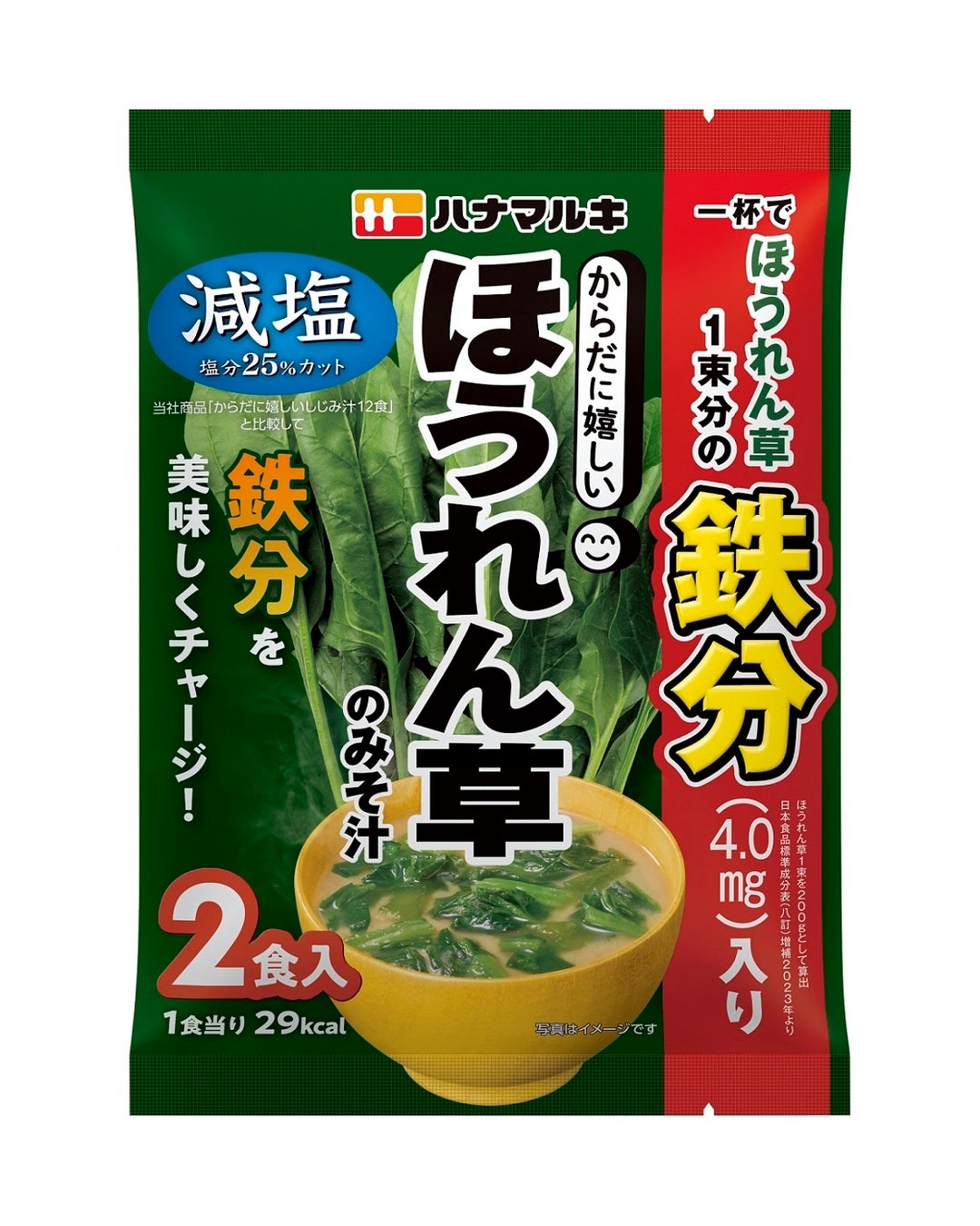 味噌・醸造製品メーカーのハナマルキ株式会社(本社:長野県伊那市、代表取締役社長:花岡周一郎、以下 当社)は、2014年の発売以来、当社のロングセラーとして好評をいただいております「ほうれん草1束分の鉄分が摂れるおみそ汁」を、「からだに嬉しい 減塩ほうれん草のみそ汁5食」と「からだに嬉しい 減塩ほうれん草のみそ汁2食」としてリニューアルし、2025年9月1日より発売いたします。