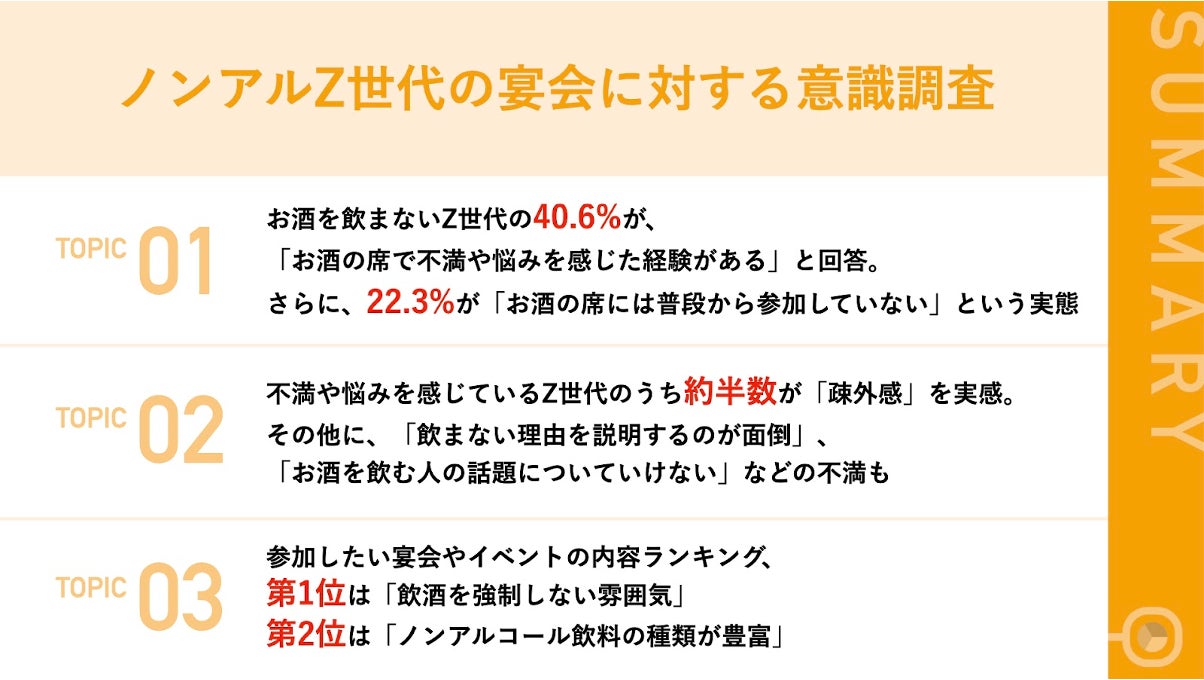 お酒を飲まないZ世代会社員の40.6%が、お酒の席に「不満や悩み」を実感 22.3%はそもそも「お酒の席に参加しない」と回答