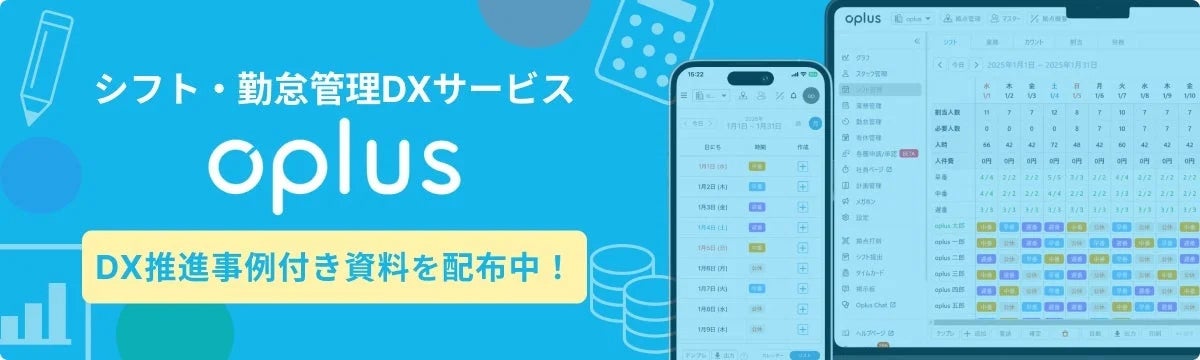 「oplus」は、ブラウザ・スマホアプリの全てに対応したシフト・勤怠管理DXサービスです。シンプルかつ直観的な操作でご使用いただけるのが特徴で、「紙・Excelの管理からシステム化へ」の1歩を踏み出せるよう、100名まで無料でご利用いただけるプランも用意しています。