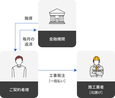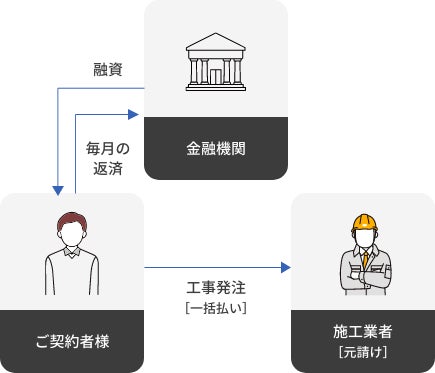 金融機関の審査不要でスピーディー:本サービスは「工事の請負契約」または「売買契約」であり、金銭消費貸借契約(借金)ではありません。金融機関による煩雑な融資審査の手間を省き、スピーディーに資金調達・導入が可能です。